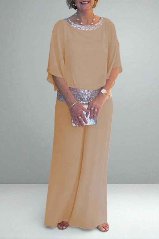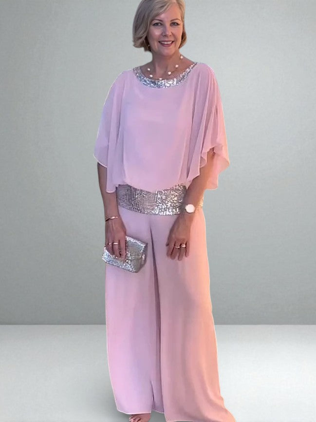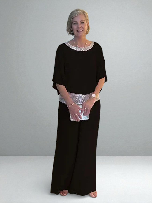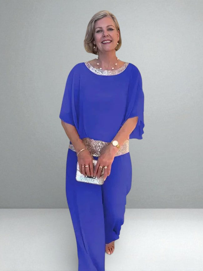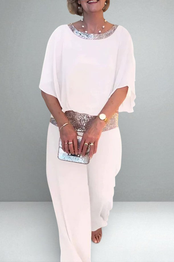 This elegant two-piece set is designed to flow, flatter, and quietly catch the light as you move. The soft drape creates a slimming silhouette, while subtle sequin detailing at the collar and waistband adds just enough shimmer to feel special — never loud, never forced.